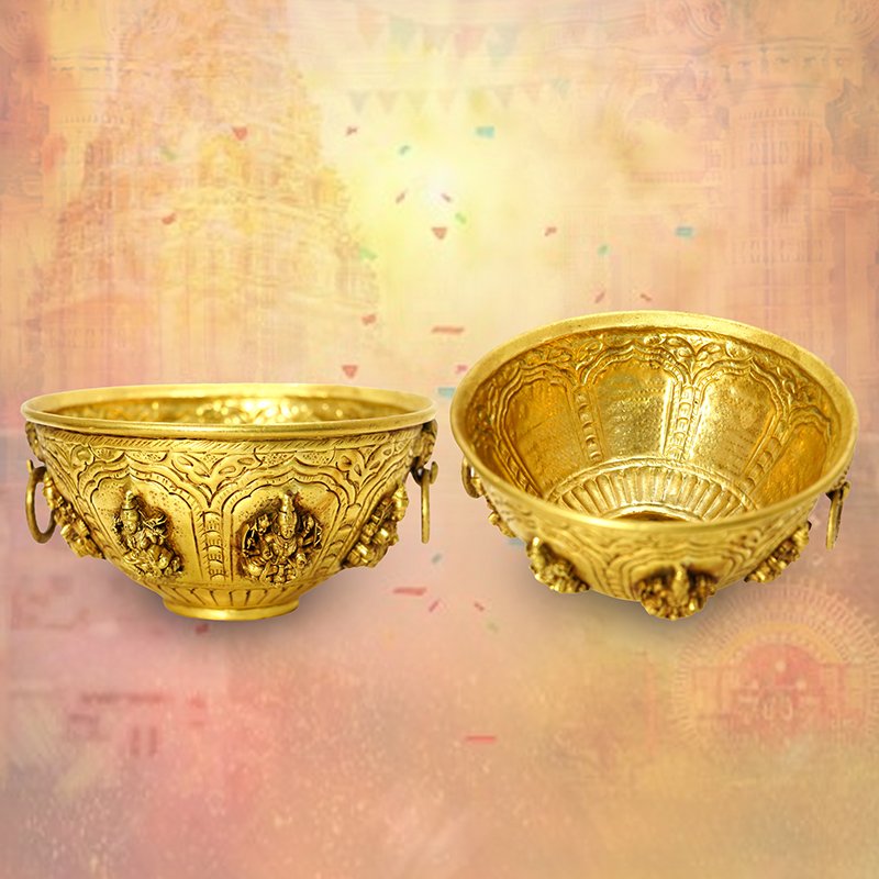 This is a traditional brass decorative bowl featuring embossed depictions of the eight forms of Goddess Lakshmi, commonly used in Indian homes for “Uruli” decor by filling it with water and floating flowers.