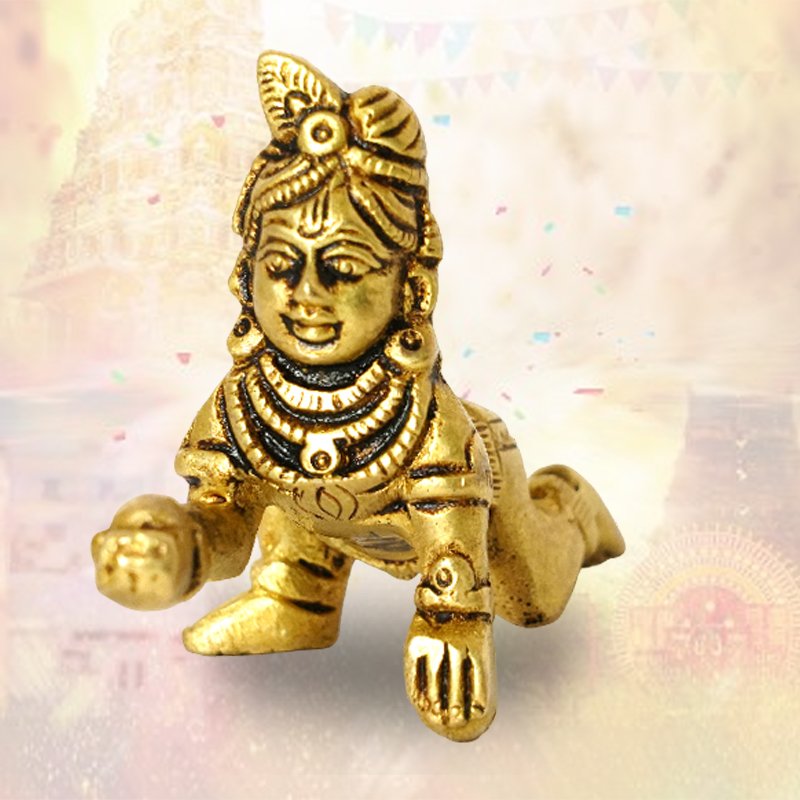 He is the infant form of the Hindu deity Lord Krishna, typically depicted as a crawling toddler holding a ball of butter (laddu) in his hand, symbolizing joy, innocence, and divine mischief.