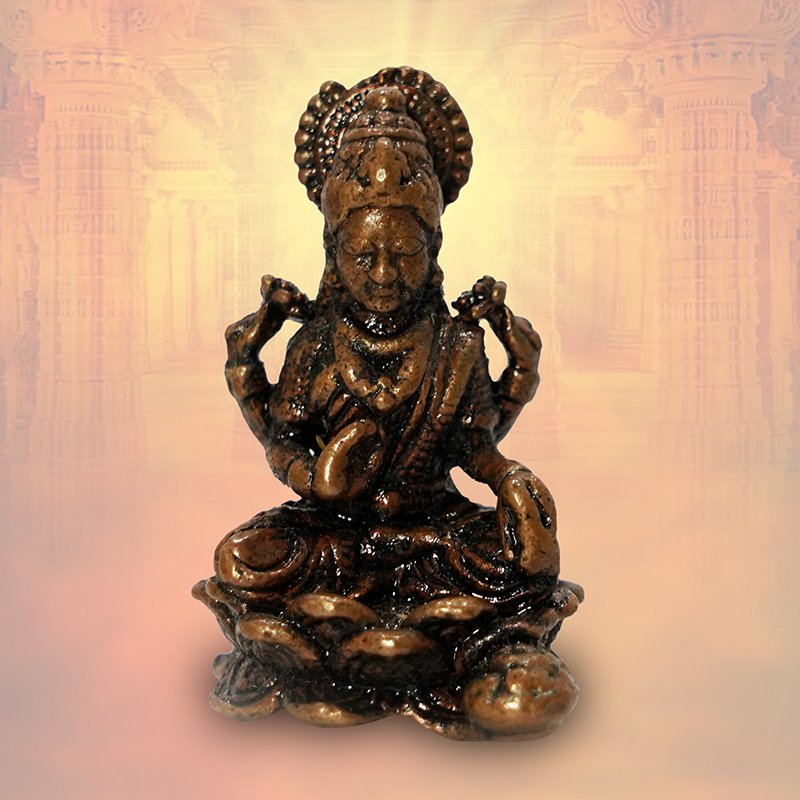 In this traditional bronze representation, Lakshmi is depicted with four arms, which symbolize the four goals of human life in Hindu philosophy: Dharma (righteousness), Artha (wealth), Kama (desire), and Moksha (liberation).