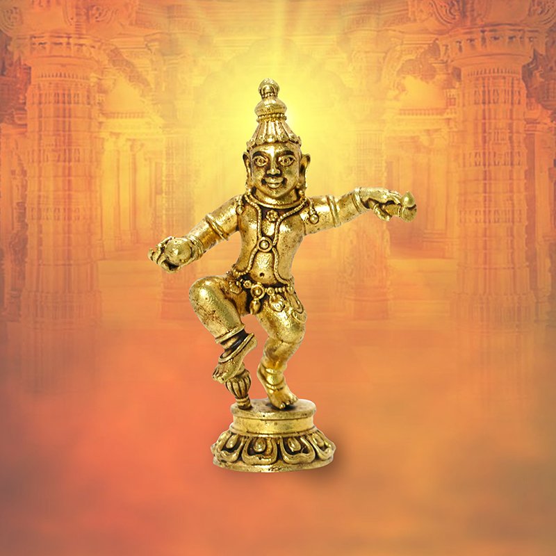 He is depicted as the mischievous Bal Krishna (child Krishna) joyfully dancing while holding a ball of freshly churned butter in his hand.